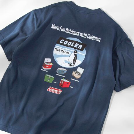 バックに涼し気なペンギンとコールマンのクーラーボックスがプリントされ、アウトドアの楽しさを演出したプリントTシャツ。