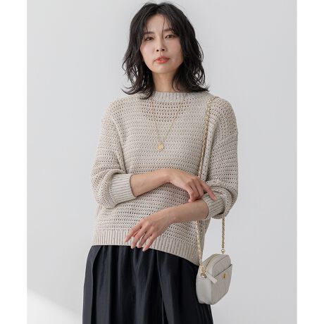トレンドのスパンコール素材を使用して春糸で仕上げたニット。透け感の少ない透かし柄で、プルオーバーとして早い時期から着用できます。ややボートネックながらシャツと合わせられる襟ぐりになっていて、肌寒さが残る春にはインナーにブラウスやカットソーを合わせるのもおすすめです。7分袖なので暑くなる夏前まで、長いシーズン着用できるのもうれしいポイント。カラーは抜け感のあるライトグレー(#003)、シックなブラック(#005)、やわらかな印象のベージュ(#033)の3色展開です。