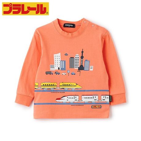 レールを走る新幹線と街並みのプリントが目を引く長袖Tシャツです。