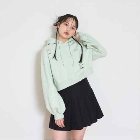 切りっぱなしデザインがトレンド感のある裏毛プルオーバーです。