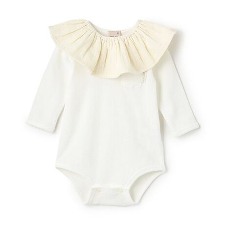 たっぷりとしたフリルが華やかなスタイつきロンパースです。