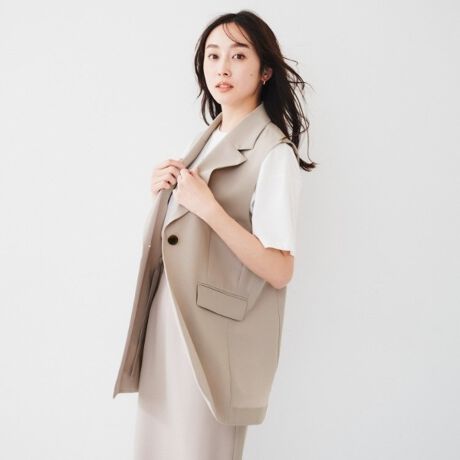 春のキレイめレイヤードに活躍しそうなジレは、シングルのデザインで着こなししやすいアイテムです。