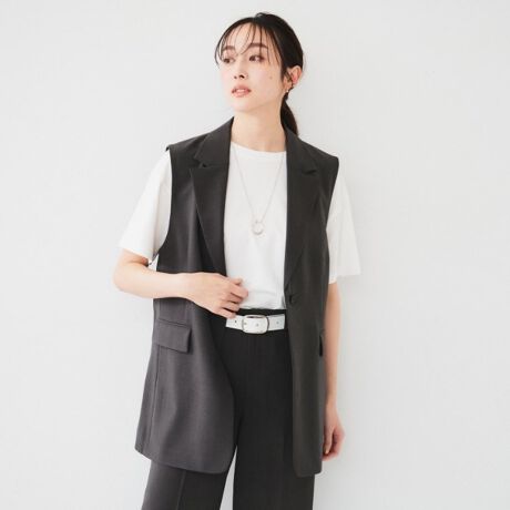 春のキレイめレイヤードに活躍しそうなジレは、シングルのデザインで着こなししやすいアイテムです。