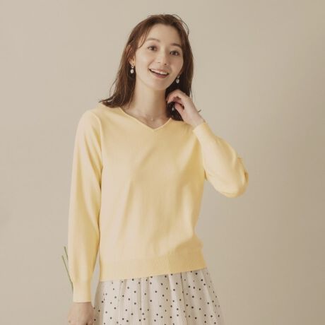 浅めのVネック開きが首周りをすっきりと見せつつ、深すぎない開きで着やすいデザイン。