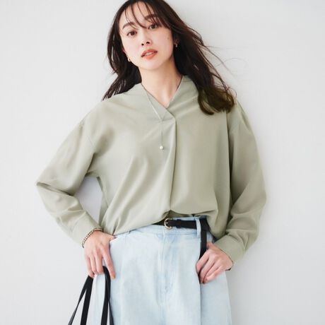 ゆったりしたシルエットのシャツは、フロント部分が重ねタックのデザインになっていて、後身頃にはギャザーがたっぷると入っています。