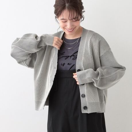 デザイン性のある細ストライプの編み柄が1枚でサマになるカーディガンです。