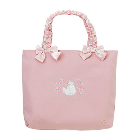 ペールトーンの上品な刺繍で、お花に囲まれた白猫キャサリンちゃんがかわいいレッスンバッグ!