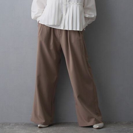 タックを入れてウエスト周りをすっきりさせたワイドパンツ。