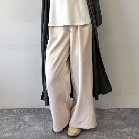 タックを入れてウエスト周りをすっきりさせたワイドパンツ。