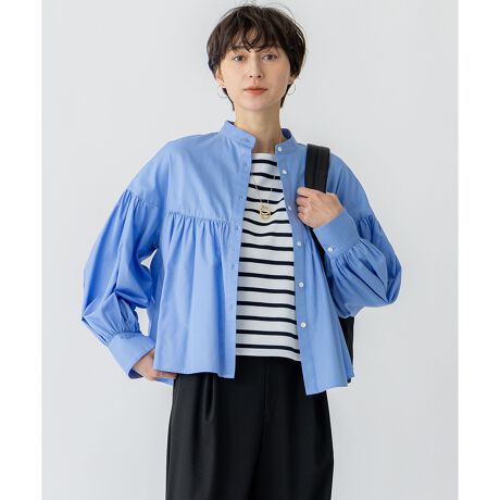 上身頃はコンパクトな作りで、胸元あたりからギャザーをふんだんに入れたボリュームブラウスです。胸下からぐるりと切り替えてドラマチックにコントラストを効かせることでメリハリの利いた、華奢見えするシルエットに仕上げています。襟ぐりは顔周りをすっきりと見せてくれるスタンドカラーです。短丈と相性のいいワイドパンツやタイトスカート、ナローなスカートと合わせると、すっきりと見え、スタイルアップが叶います。カラーは定番無地のホワイト(#001)、爽やかなサックス(#072)、こなれ感のあるオレンジ×サックスストライプ(#120)、清潔感のあるブルー×イエローストライプ(#172)、オンオフ使えるホワイト×グリーンストライプ(#101)の5色展開です。
