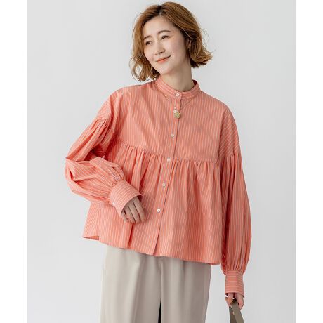 上身頃はコンパクトな作りで、胸元あたりからギャザーをふんだんに入れたボリュームブラウスです。胸下からぐるりと切り替えてドラマチックにコントラストを効かせることでメリハリの利いた、華奢見えするシルエットに仕上げています。襟ぐりは顔周りをすっきりと見せてくれるスタンドカラーです。短丈と相性のいいワイドパンツやタイトスカート、ナローなスカートと合わせると、すっきりと見え、スタイルアップが叶います。カラーは定番無地のホワイト(#001)、爽やかなサックス(#072)、こなれ感のあるオレンジ×サックスストライプ(#120)、清潔感のあるブルー×イエローストライプ(#172)、オンオフ使えるホワイト×グリーンストライプ(#101)の5色展開です。