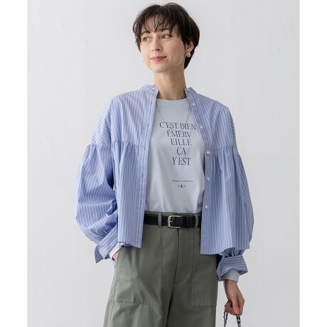 上身頃はコンパクトな作りで、胸元あたりからギャザーをふんだんに入れたボリュームブラウスです。胸下からぐるりと切り替えてドラマチックにコントラストを効かせることでメリハリの利いた、華奢見えするシルエットに仕上げています。襟ぐりは顔周りをすっきりと見せてくれるスタンドカラーです。短丈と相性のいいワイドパンツやタイトスカート、ナローなスカートと合わせると、すっきりと見え、スタイルアップが叶います。カラーは定番無地のホワイト(#001)、爽やかなサックス(#072)、こなれ感のあるオレンジ×サックスストライプ(#120)、清潔感のあるブルー×イエローストライプ(#172)、オンオフ使えるホワイト×グリーンストライプ(#101)の5色展開です。