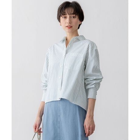 スタンダードさを残しつつも今っぽく短丈にしたシャツブラウスです。シルエットは短丈との相性抜群な裾広がりのテントラインになっていて、袖にもタックをふんだんに入れてボリュームを出すことによってバランスよく着用していただけます。きちんと感のあるシャツなら、トレンドのクロップド丈も取り入れやすい。カラーは定番無地のホワイト(#001)、爽やかなサックス(#072)、こなれ感のあるオレンジ×サックスストライプ(#120)、清潔感のあるブルー×イエローストライプ(#172)、オンオフ使えるホワイト×グリーンストライプ(#101)の5色展開です。