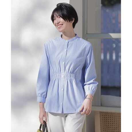■デザインサッと羽織るだけでサマになる、バンドカラーの前開きブラウス。前ウエストには細かなギャザーの入ったゴムシャーリングを施し、ふんわりとした立体感が生まれるデザインです。動くたびに軽やかに揺れるシルエットと、さらりとした生地が肌に心地よく、思わず毎日手に取りたくなる1枚。前を開けて羽織りとしても使えるので、着こなしの幅が広がるのも魅力。ワイドパンツと合わせれば上品さの中にリラックス感が漂い、大人の余裕を感じさせるスタイルに。春風を纏っているかのような爽やかさが楽しめます。