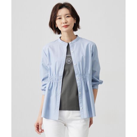 ■デザインサッと羽織るだけでサマになる、バンドカラーの前開きブラウス。前ウエストには細かなギャザーの入ったゴムシャーリングを施し、ふんわりとした立体感が生まれるデザインです。動くたびに軽やかに揺れるシルエットと、さらりとした生地が肌に心地よく、思わず毎日手に取りたくなる1枚。前を開けて羽織りとしても使えるので、着こなしの幅が広がるのも魅力。ワイドパンツと合わせれば上品さの中にリラックス感が漂い、大人の余裕を感じさせるスタイルに。春風を纏っているかのような爽やかさが楽しめます。
