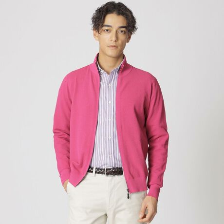 季節変化が激しい時期に、薄手の羽織物として気軽にご着用いただけるデザインなのでハイネックのフルジップニットは季節のおすすめアイテムです。