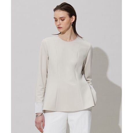 ■デザイン前後差のついた動きのあるヘムラインが特徴のペプラムブラウスです。身頃に縦に入ったパーツ切り替えがスタイリッシュな印象に。後身頃やカフスに光沢素材を使用し、コントラストをつけました。セレモニーシーンや通勤など幅広いシーンで活躍します。同シリーズのパンツとセットアップでの着用もおすすめです。