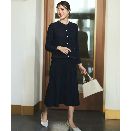 ・繊細なラメ糸と意匠糸を使用した、上品で華やかなツイードジャケット・プリーツ見えするフレアニットスカートは、短すぎない丈感で上品な動きのあるシルエットが魅力