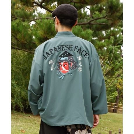 [型番:75H-5101-2025]日本を代表する「顔」の刺しゅうが背中に映える羽織。浮世絵に描かれた天狗、恵比寿、福顔、金太郎を背中に刺しゅうで表現しました。胸元には版画で使われるバレンをモチーフにしたワンポイントをあしらい、裏地にも浮世絵を大胆にプリント。さらりとした生地で年間を通して着られ、性別を問わず楽しめる粋な和モダン羽織です。