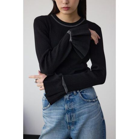 ■シアーコンビフレアスリーブニット■ポイントシンプルでタイトめなリブニットをベースに、フレアスリーブデザインが目を惹くニットトップスです。■ディティールシアー感のある糸とのブロッキングデザインがポイントです。リブニットですがぴったりし過ぎず、程よいフィット感が嬉しいポイントです。フレアスリーブがさりげなく、女性らしい雰囲気を演出します。■スタイリングシンプルなボトム合わせはもちろん、タイトなシルエットなので、トレンドのビスチェやベストのインナーとしても好相性です。250ISC30-104C フロントジップバルーンキャミのインナーとして合わせるのがおすすめです。■生地清涼感のある強撚素材と、ストレッチの効いた糸をプレーティングして編み立てたニットです。配色部分にラメを使用しています。透け感:なし裏 地:なし伸縮性:あり光沢感:なし[注意事項]※画像の商品はサンプルです。実際の商品と仕様、加工が若干異なる場合があります。※画像の商品は光の照射や角度、お使いのモニター環境により、実物と色味が異なる場合がございます。※着用、お取り扱いの際は、アテンションタグをご確認ください。