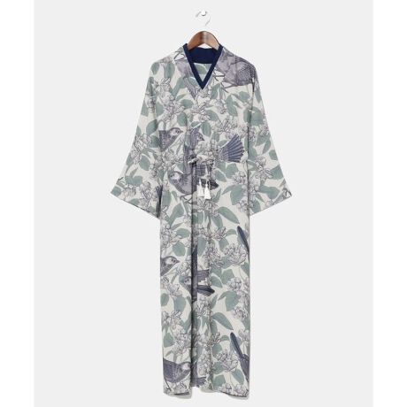 [型番:76R-5102-2025]花々に囲まれた鳥たちが自由に飛び交うように描かれたワンピース。かわいらしい大正モダンテイストのイラストと着物をイメージしたワンピースのコントラストが上品な一枚。心地良いさらりとした生地感です。