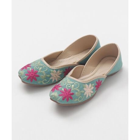 [型番:IRJP5601-2025]インドの伝統的なフラットシューズ「ジュッティ」コットンの生地に大柄な花が映え、足元を華やかにしてくれます。クッション性もあり、歩きやすい。