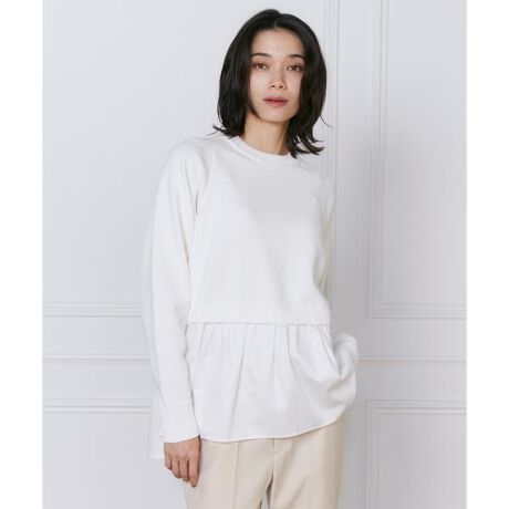 軽やかでドライタッチな綿ポリエステル糸を使用。高めのウエスト位置で切り替えることでスタイルアップ効果も。裾部分にはほどよい光沢感が上品な印象の綿サテン生地を使用し、レイヤード風な見え方に。1枚でデザイン性があり、シンプルなパンツ合わせでも簡単に様になるアイテムです。・水洗い可■サンプル撮影商品■こちらの商品はサンプルでの撮影となっております。実際の商品とは、サイズや色味、素材、デザイン等の仕様が若干変更になる場合がございます。