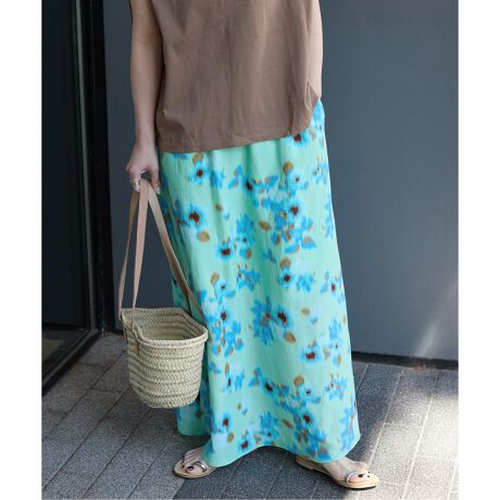 トレンドのぼやけた柄のフローラルプリントのリーンフレアスカート。