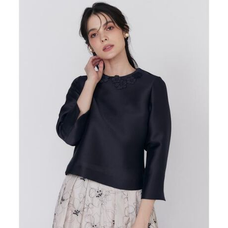 ネイビーを基調とした洗練されたデザインのブラウス。ネックラインには大小異なるフラワーモチーフの刺繍をランダムに配置して華やかさを添えています。フラワーモチーフは2色の糸で丁寧に作り込まれたオリジナルデザインのケミカルレースを使用しており、重厚感のある表情が特徴です。袖は8分袖でスリットが入っており、折り返してアレンジも楽しめます。驚きの軽さとシルクのような光沢、ふくらみが特徴の素材を使用し、吸水速乾機能も備えているため快適な着心地が持続します。レース部分にはポリエステル素材を使用し、上品な光沢と美しいドレープを実現しています。ジャケットを羽織ったフォーマルな装いやスカートと合わせた特別な日の装いにもぴったりです。・裏地なし・後ろファスナーあり・水洗い可■サンプル撮影商品■こちらの商品はサンプルでの撮影となっております。実際の商品とは、サイズや色味、素材、デザイン等の仕様が若干変更になる場合がございます。