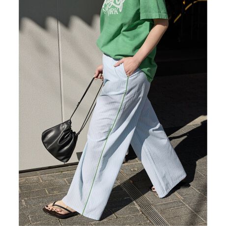 脇に配色パイピングを施し縦のラインを強調することでワイドシルエットでもスッキリとした印象に見えます。ロゴTやシャツなどとカジュアルに合わせつつ、小物使いは綺麗目に合わせるのがおすすめです。