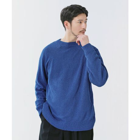 首元のデザインは、キレイめにもカジュアルにも合わせやすいベーシックなクルーネックを採用。襟ぐり、裾、袖口にはリブを配しており、切り替えデザインがさりげないポイントになります。リラクシーな雰囲気のラグランスリーブとゆとりを持たせたサイジングで、抜け感のあるニットに仕上げました。