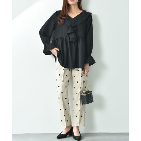センターライン入りのテーパードパンツ。パッと目を惹くドット柄でいつものスタイルのアクセントに◎