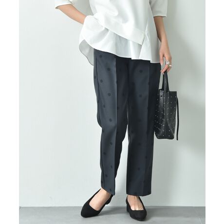 センターライン入りのテーパードパンツ。パッと目を惹くドット柄でいつものスタイルのアクセントに◎