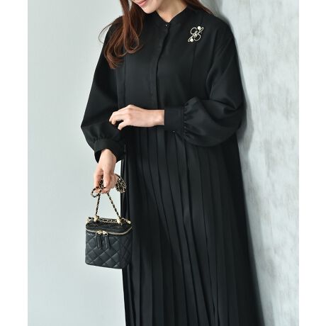本体は程良い肉感のストレッチ素材を使用。透け感もなく、きちんと感もしっかりKEEPできるのが嬉しいポイントです。首回りはコンパクトなバンドカラータイプ。プリーツは上品な仕上がりになっていますので、主張しすぎることなくさらりと着ていただけます。スタイリングに迷った時にお勧めな1枚。さり気ない大人の抜け感が演出できるお勧めなワンピースです。