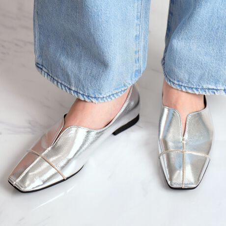 ・履き口のVカットとアウトステッチがポイント。モードに履けるフラットシューズです。
