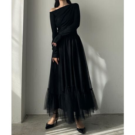 Louere 裾切替フリルチュールティアードスカート【一部ペチスカートセット】