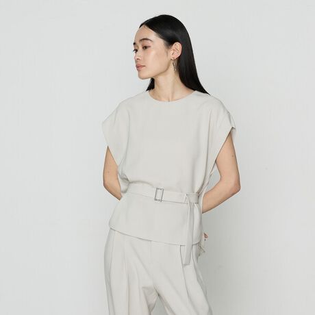 スリットから内側にベルトを通し、前はウエストをマークしつつ後ろはふんわりと涼しい着こなしとベルトループに通し、ウエストを絞るスタイリングと、ベルトなしのスタイリングの三通りが可能です。