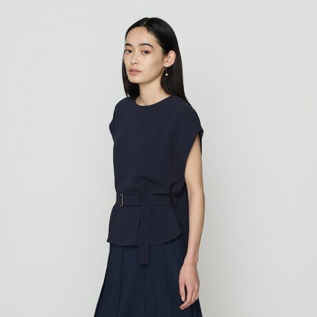 スリットから内側にベルトを通し、前はウエストをマークしつつ後ろはふんわりと涼しい着こなしとベルトループに通し、ウエストを絞るスタイリングと、ベルトなしのスタイリングの三通りが可能です。