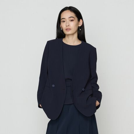 ミニマルなノーカラージャケットはシャープでありながらも女性らしい印象です。