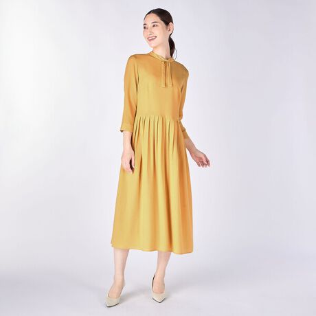 やわらかで上品な生地感が特徴のクレープデシンで仕立てたワンピース。ウエスト下にはプリーツ加工のアクセントがスタイリッシュなデザインポイント。ゆとりのあるシルエットに裾に向かってフレアに広がるドレープ感が美しくフェミニンなデザインポイント。一枚でおしゃれなお出かけコーディネートが完成するアイテムです。