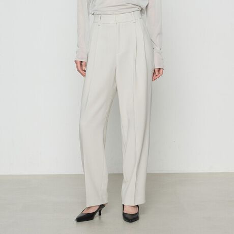 2タックの程よい分量のパンツはドレープ性のある素材によりきれいに落ちて脚長に見える絶妙なシルエットが旬な印象です。