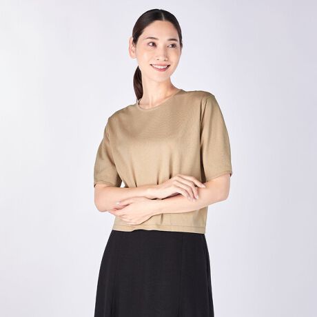 ゆとりのある特徴的な袖のシルエットが魅力の5分袖ニット。エレガントな雰囲気を演出するハイゲージな編み目の表面感も魅力。シンプルなデザインで、モードからカジュアルまで幅広いスタイリングにマッチ。スカート・パンツとボトムを選ばず合わせやすく、毎日のコーディネートで活躍するアイテムです。