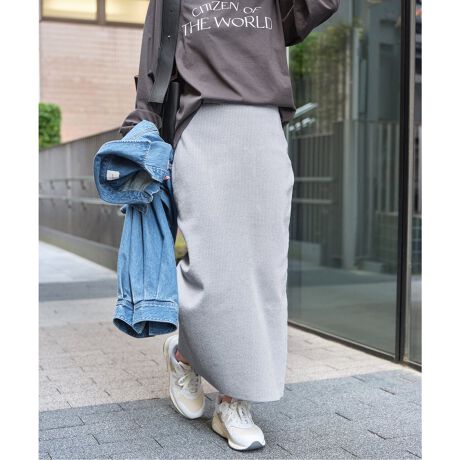 メタルライクな光沢のある糸をリブ組織で編んだニットタイトスカートです。