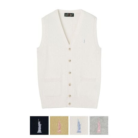 新作の女神刺繍入り、前開きベスト。強くねじりを加えて耐久性を高めたハイツイストドライタッチコットンを使用。表面はサラリとして着心地の良いことが特徴です。ほどよい開きのVネックはインナーのシャツとの相性もよく、リボン・ネクタイとのバランスも絶妙です。EASTBOY独自の仕様で強度UPしています。・肩のほつれを防ぐ為、通常より長めに糸始末をしています。・リンキング糸にスパン糸を1本入れ、強度を上げています。・リブのリンキング部分には、ほつれを防ぐ為にミシンで縫いを入れています。