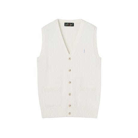 新作の女神刺繍入り、前開きベスト。強くねじりを加えて耐久性を高めたハイツイストドライタッチコットンを使用。表面はサラリとして着心地の良いことが特徴です。ほどよい開きのVネックはインナーのシャツとの相性もよく、リボン・ネクタイとのバランスも絶妙です。EASTBOY独自の仕様で強度UPしています。・肩のほつれを防ぐ為、通常より長めに糸始末をしています。・リンキング糸にスパン糸を1本入れ、強度を上げています。・リブのリンキング部分には、ほつれを防ぐ為にミシンで縫いを入れています。