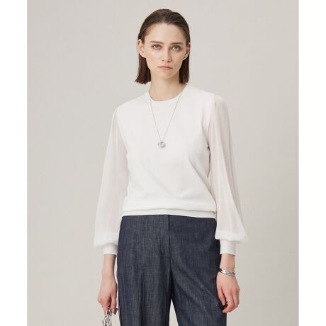 ■デザインシアースリーブが優美な印象のコンビネーションニットです。優しくふんわりとした量感のある袖も袖口リブで締めることで、シルエットにコントラストが生まれモードな印象に。ジャケットのインナーとしても、セレモニーシーンにもお使いいただけます。