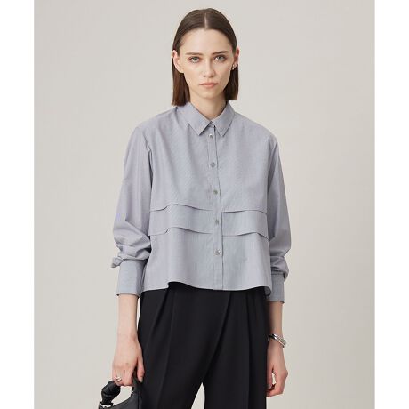 ■デザインクロップドレングスにレイヤードディテールを加えたトレンド感のあるブラウスです。シンプルかつオシャレポイントの詰まった一枚で、カジュアルにもマニッシュにも着こなせます。ワイドパンツやボリューム感のあるボトムスと合わせるのもおすすめで、今までと違った印象のコーディネートを楽しめます。