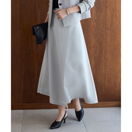■デザインアシメトリーのラップ風デザインがポイントのフレアスカートです。素材のハリ感を活かした分量感と美しいフレアーラインがポイントです。シンプルなトップスと合わせても着映え、スタイリングにアクセントを加える一枚です。