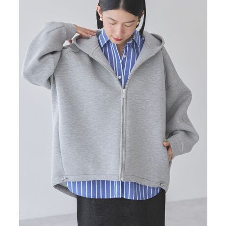 弾力感が心地よいポンチ素材のジップパーカー。ラグラン切り替えのワイドシルエットでシンプルながらも存在感のあるデザインです。丸みのあるヘムラインにはドロストコードをプラスして絞りアレンジも可能に。インナー次第でロングシーズン活躍し、フード付きのカジュアルな雰囲気がデイリースタイルにぴったりの一着です。透け感[なし]