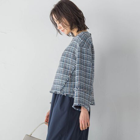 フリンジディティールを利かせた春らしいツイードブラウス。